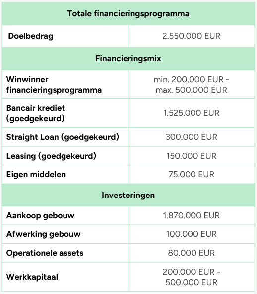 Om dit ambitieuze project te financieren, werd een financieringsmix samengesteld onder de begeleiding van Resolvus, een finance agency met sterke expertise in complexe financieringsvraagstukken. De huisbankier van Silent Walls heeft een verregaande blijk van vertrouwen getoond door een investeringskrediet toe te kennen van 1,525Mio EUR, aangevuld met een Straight Loan van 300.000 EUR. Hiermee werden de aankoop van het gebouw en de verfraaiingswerken quasi volledig gefinancierd, met slechts 75.000 EUR aan eigen middelen. Daarnaast werd via een non-bancaire leasemaatschappij voorzien in een een leasinglijn van 150.000 EUR voor onder andere een graafkraan en andere operationele assets. De Winwinner campagne vormt het sluitstuk van de financieringsronde en zal dus vooral aangewend worden als werkkapitaal.